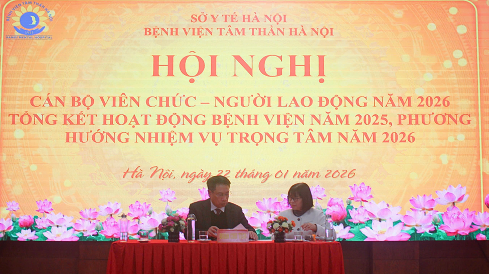 Chiều ngày 22/01/2026, Bệnh viện Tâm thần Hà Nội đã tổ chức Hội nghị tổng kết hoạt động năm 2025 và Hội nghị cán bộ, viên chức, người lao động năm 2026. Hội nghị diễn ra trong không khí dân chủ, đoàn kết và trách nhiệm, với sự tham dự của Ban Giám đốc bệnh viện, Ban Chấp hành Công đoàn, Ban Thanh tra nhân dân cùng đại diện cán bộ, viên chức, người lao động đến từ các khoa, phòng trong toàn viện.
